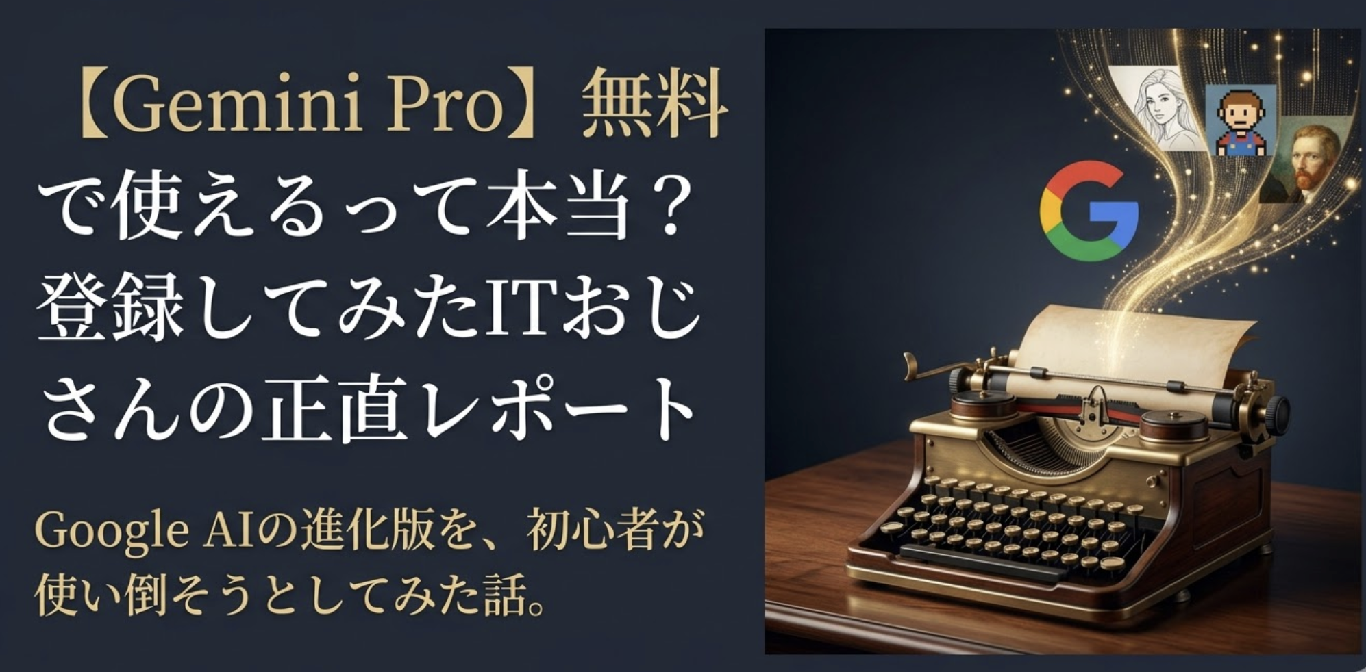 この記事のアイキャッチ画像も、Imagen 3で作りました。「AIツールを使うITおじさんのイメージ」という雰囲気の指示を入れるだけで、それらしい画像がすぐに出てきます。フリー素材を探し回る手間と比べると、これは素直に便利だと感じました。