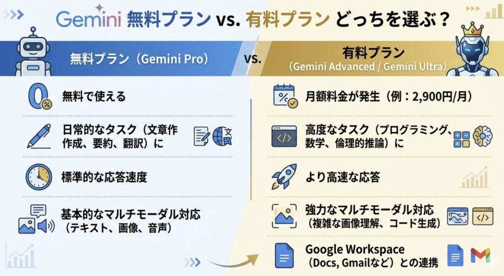 Geminiには無料版と、有料の「Gemini Pro(Google AI Pro)」があります。